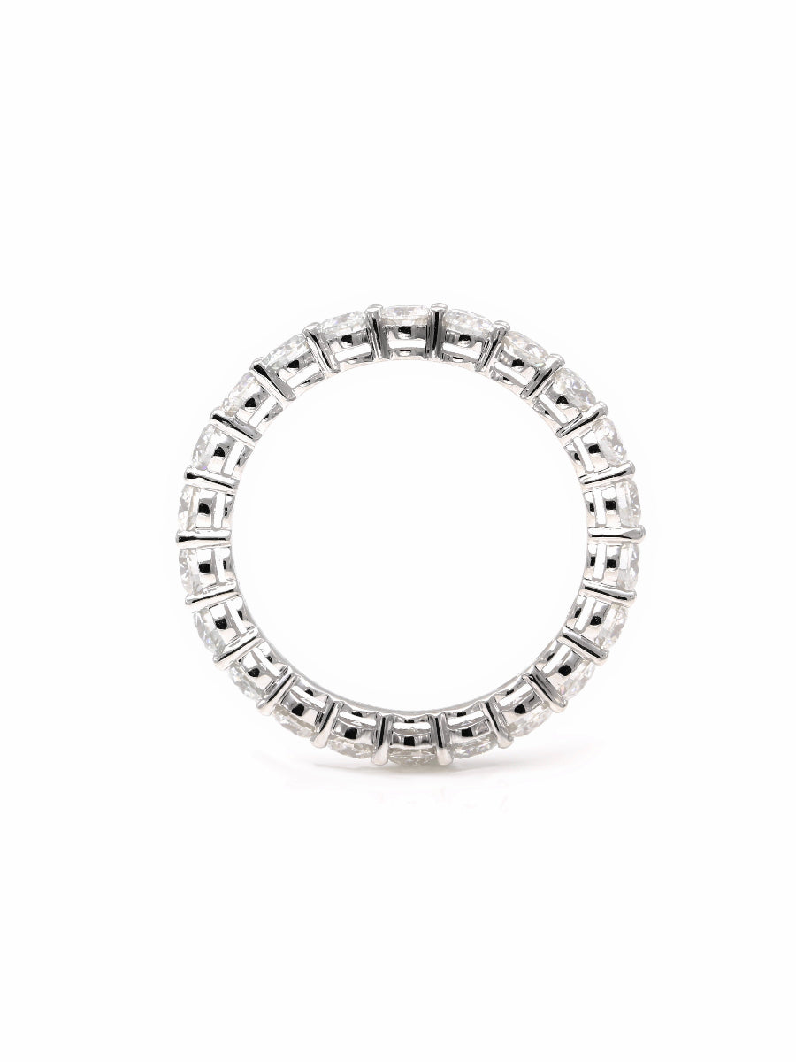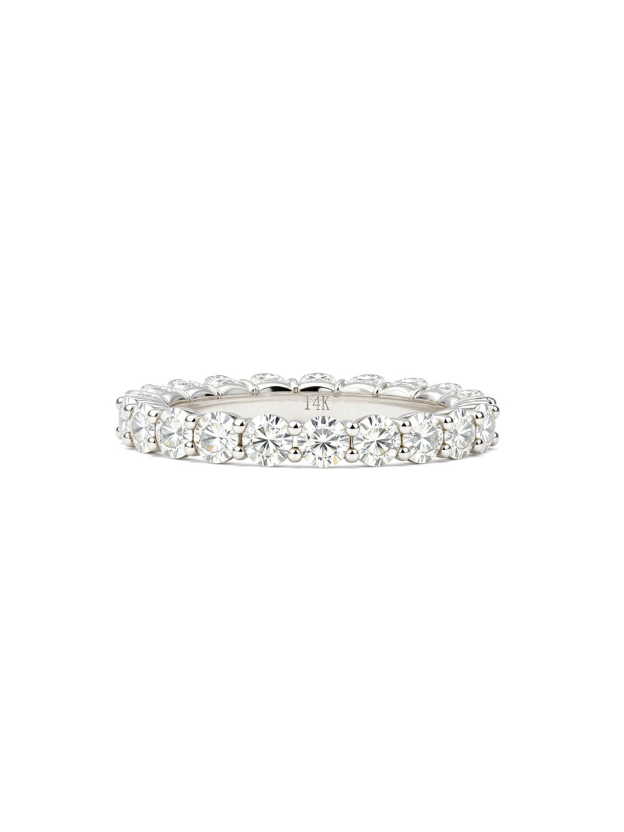 Brilliant lab-grown moissanite beautifully encircles the majority of the band in this timeless eternity wedding ring's classic shared prong setting.