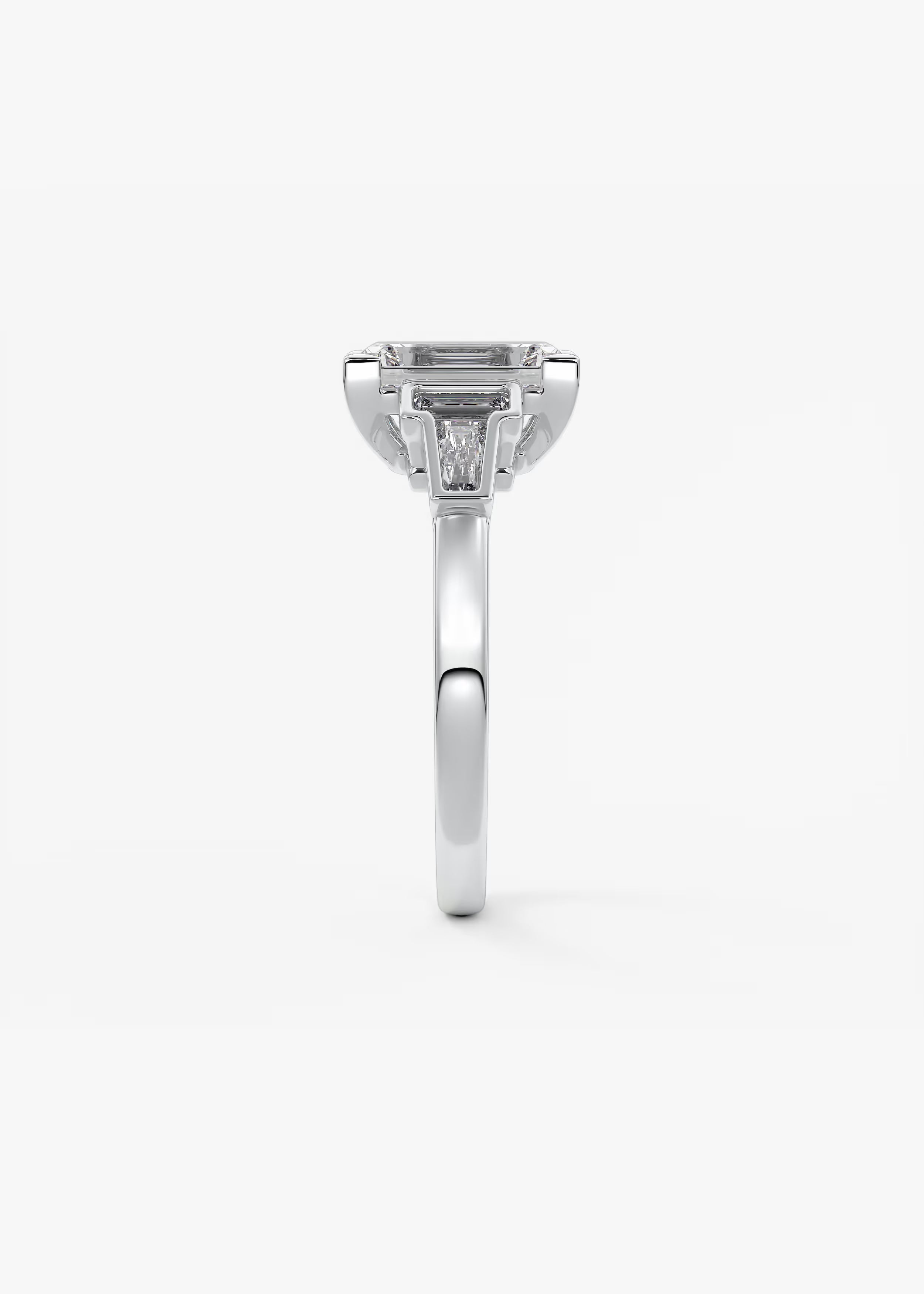 A refined three-stone engagement ring design featuring a prominent Emerald-cut center stone secured in a prong setting, flanked by tapered baguette accent diamonds that draw the eye inward, with a sleek, polished band creating a balanced and sophisticated profile.