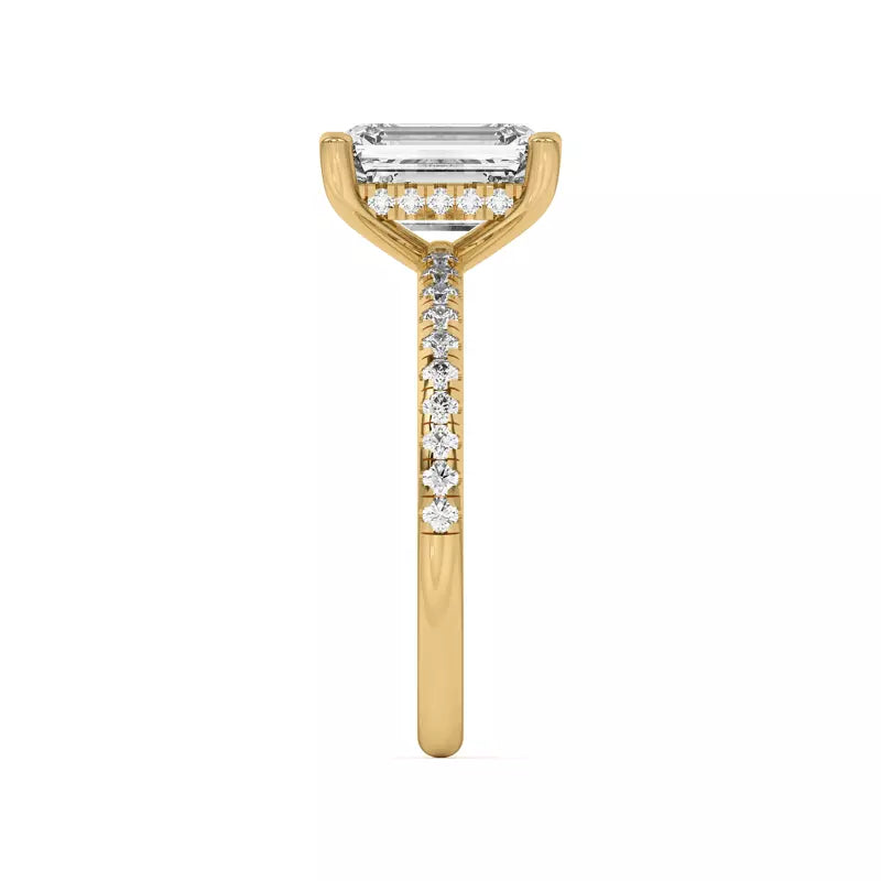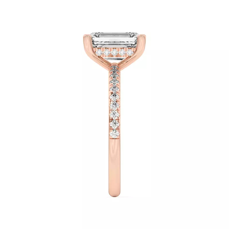 A romantic pavé engagement ring design featuring a prominent Emerald-cut center stone secured in a four-prong setting, with smaller diamonds adorning the band in a continuous pavé style for radiant sparkle and an elegant, timeless profile.