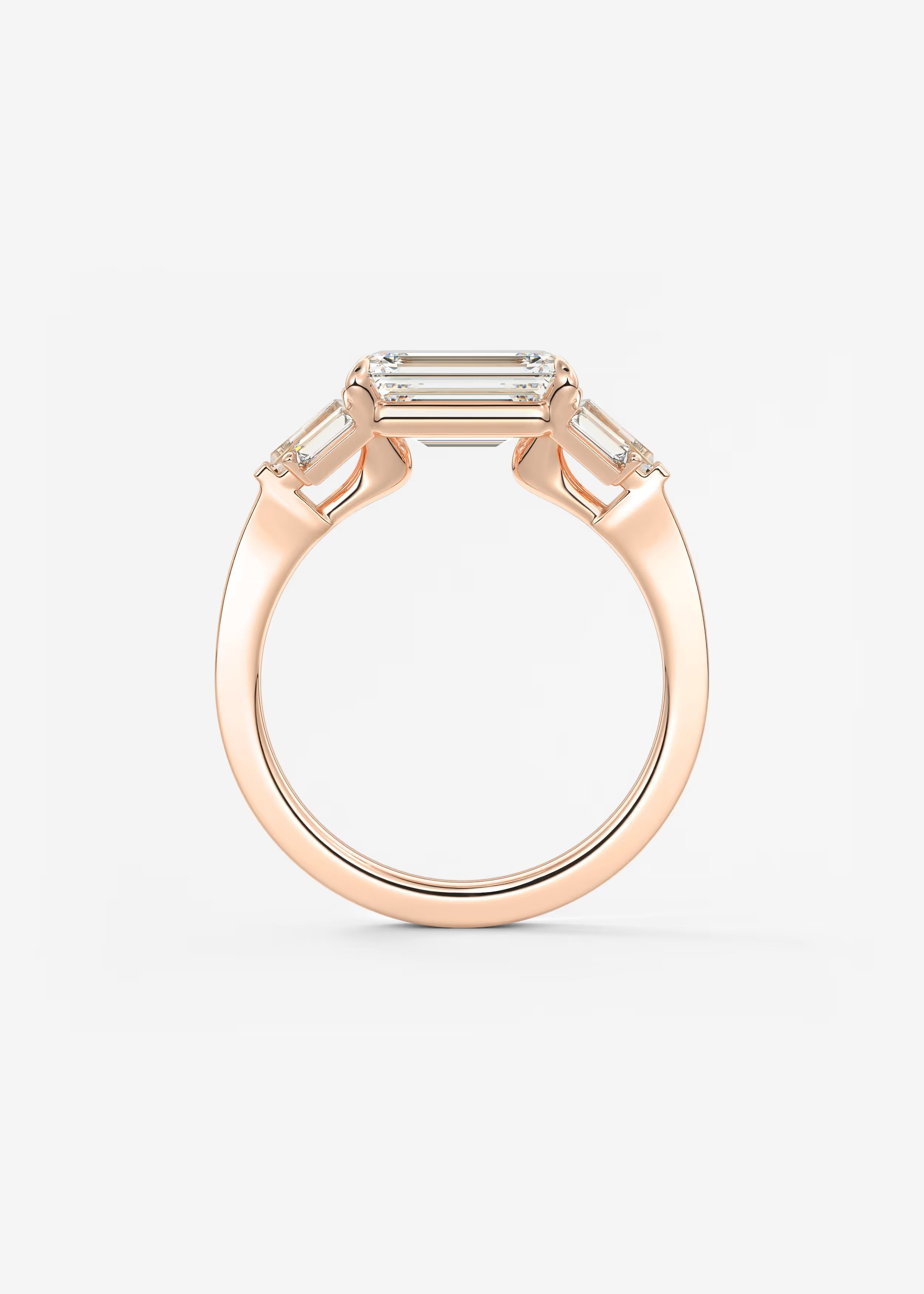 Seven-stone engagement ring design featuring a prominent emerald-cut center stone secured in a four-prong setting, flanked by baguette-cut side stones arranged in a tapered formation, with a polished band creating a balanced, timeless, and sophisticated profile.