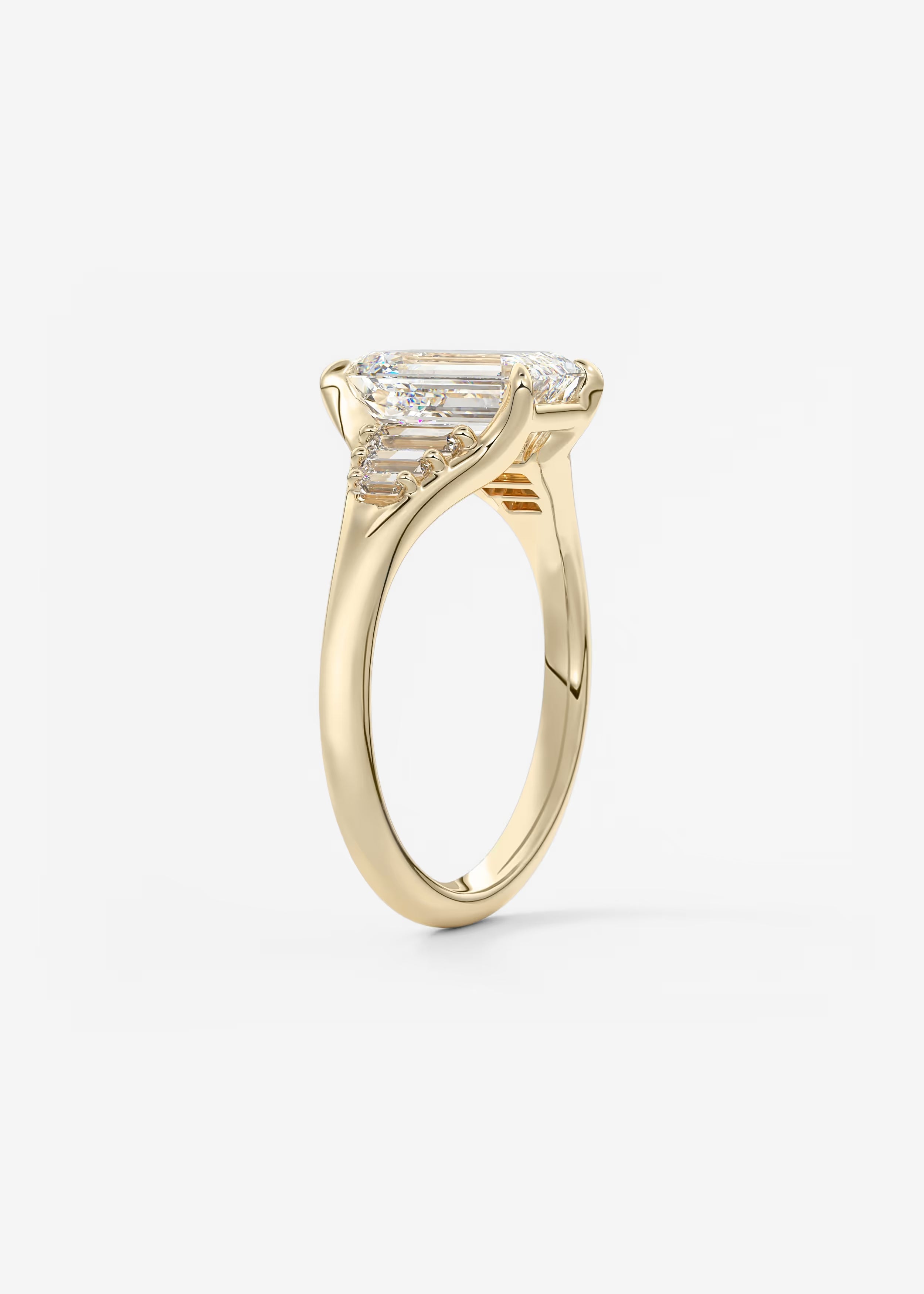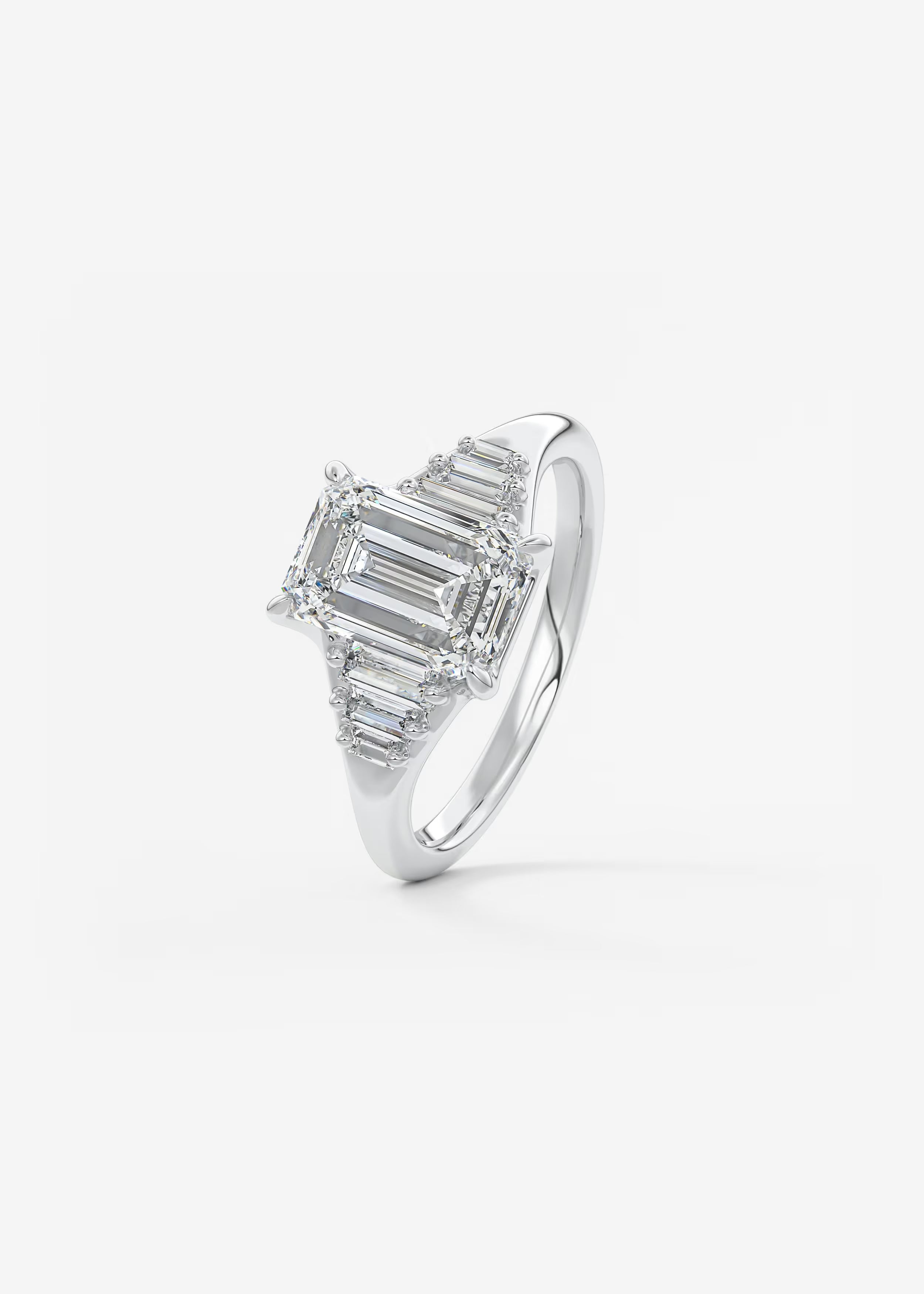 A classic three-stone engagement ring design featuring a prominent emerald-cut center stone secured in a four-prong setting, flanked by tapered baguette accent diamonds that enhance its symmetry and brilliance, with a polished band creating a refined and timeless silhouette.
