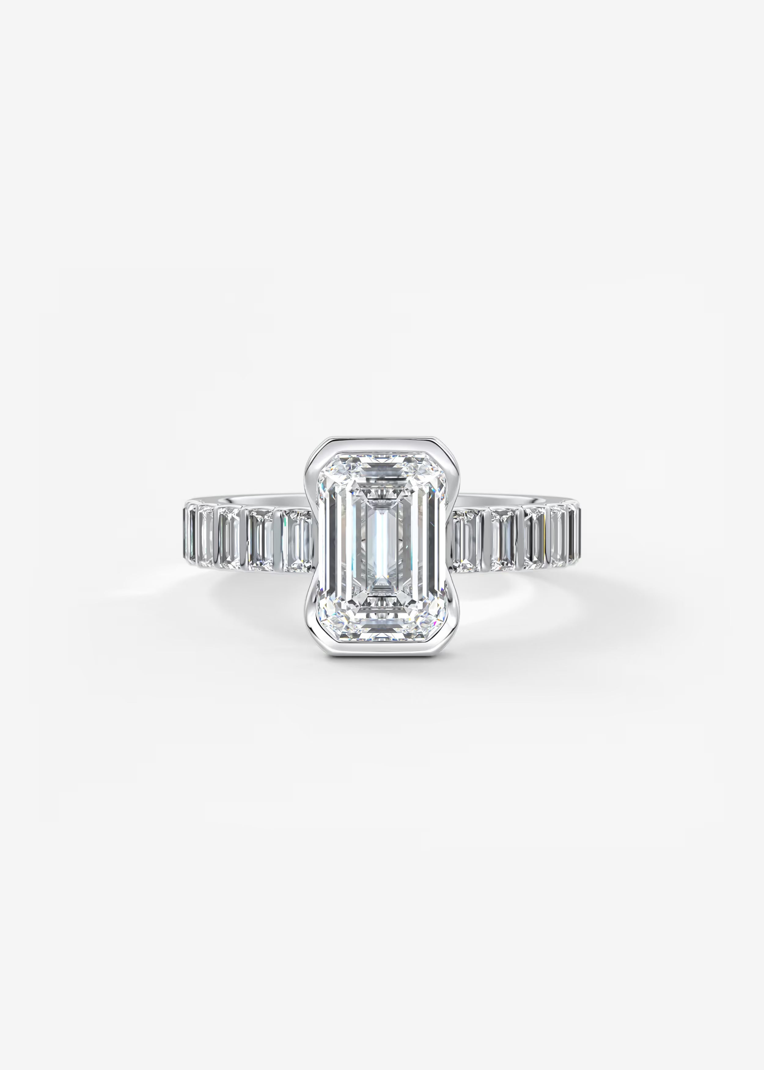 Emerald Cut Half Bezel Engagement Ring with Baguette Cut Diamond Band
