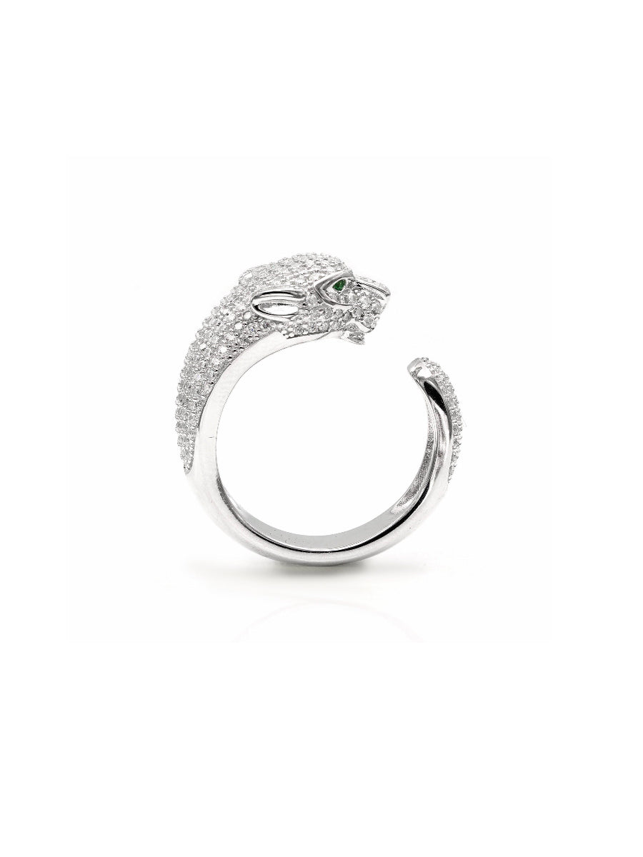 This luxurious silver ring features a beautifully crafted panther design with intricate diamond detailing and an emerald eye for a bold statement.