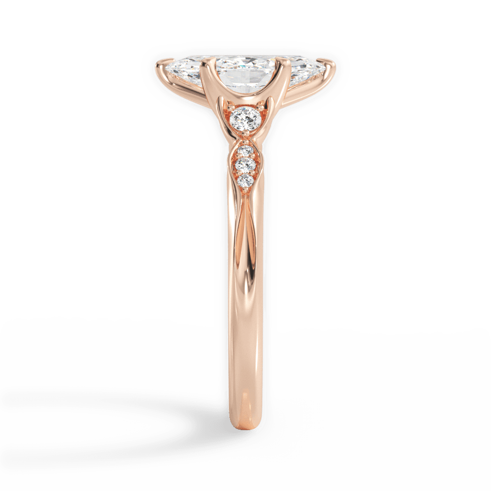 A classic engagement ring design featuring a prominent Marquise-cut center stone secured in a four-prong setting, accented on each side by a marquise-shaped frame set with a small round diamond for added sparkle and a refined, timeless profile.