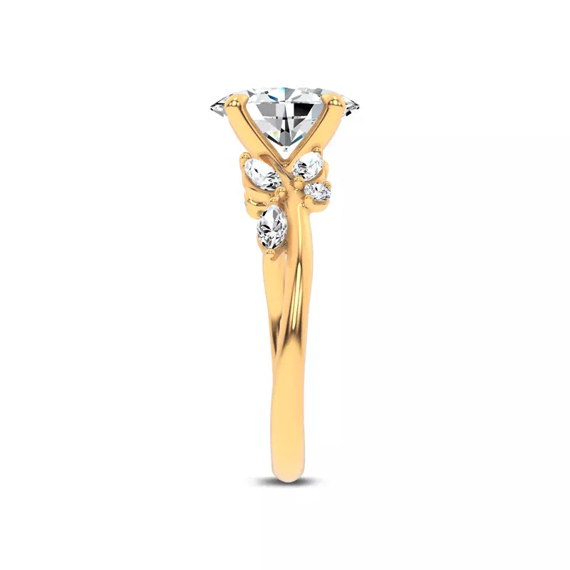 An artistic cluster-accented engagement ring design featuring a prominent Round-cut center stone secured in a four-prong setting, flanked by organically arranged round accent diamonds that add whimsical brilliance, creating a visually striking profile that blends classic geometry with modern charm.
