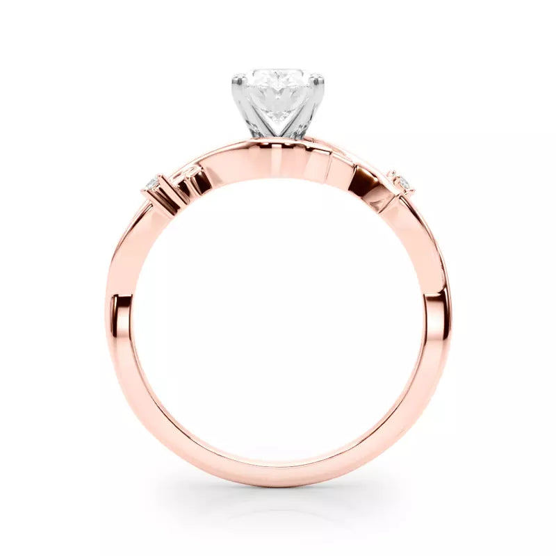 A romantic vine-inspired engagement ring design featuring a prominent Oval-cut center stone held in a secure four-prong setting, flanked by smaller diamonds nestled within a delicate, nature-inspired band for continuous sparkle and an elegant, timeless profile.
