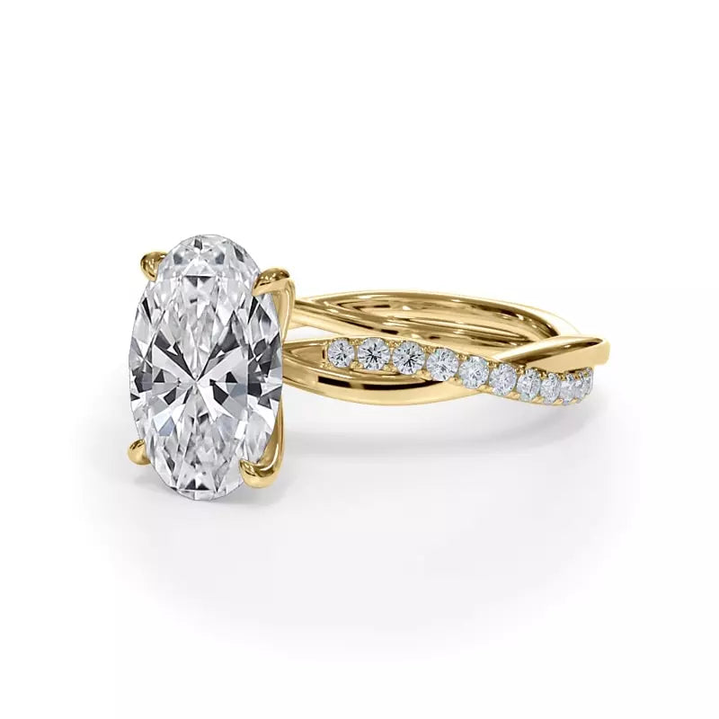 A contemporary twist engagement ring design featuring a striking Oval brilliant-cut center diamond in a secure four-prong setting, with one strand of the band adorned with pavé-set diamonds and the other polished for contrast, creating a graceful, modern profile.