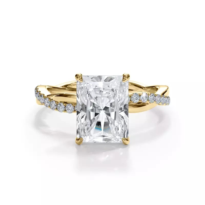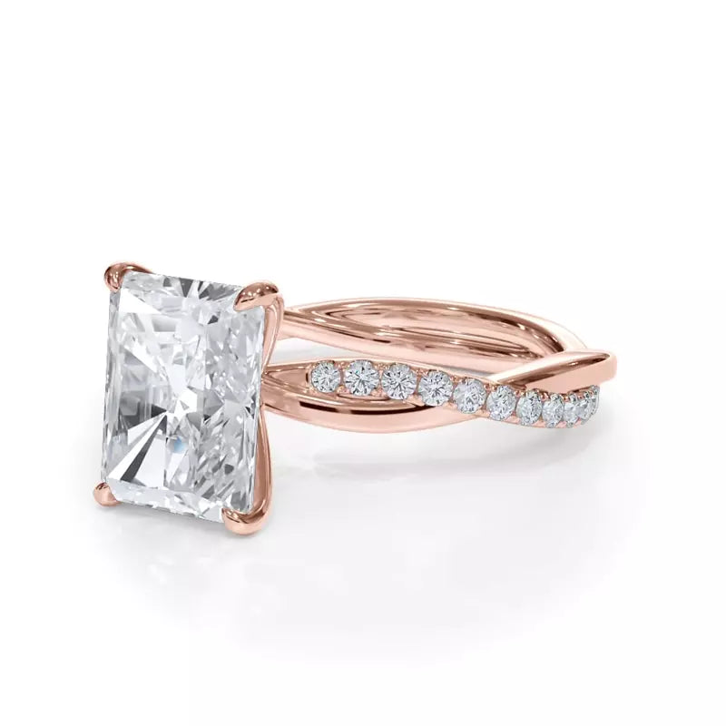 A contemporary twist engagement ring design featuring a striking Radiant brilliant-cut center diamond in a secure four-prong setting, with one strand of the band adorned with pavé-set diamonds and the other polished for contrast, creating a graceful, modern profile.