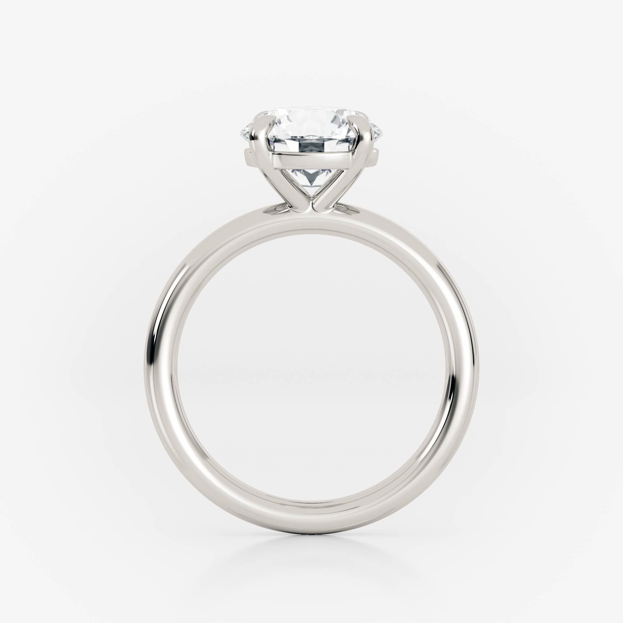 A classic solitaire engagement ring design featuring a prominent round brilliant-cut center stone secured in a four-prong setting, set atop a sleek, polished band that enhances the diamond’s fire and clarity, creating a timeless silhouette with understated elegance and refined simplicity.