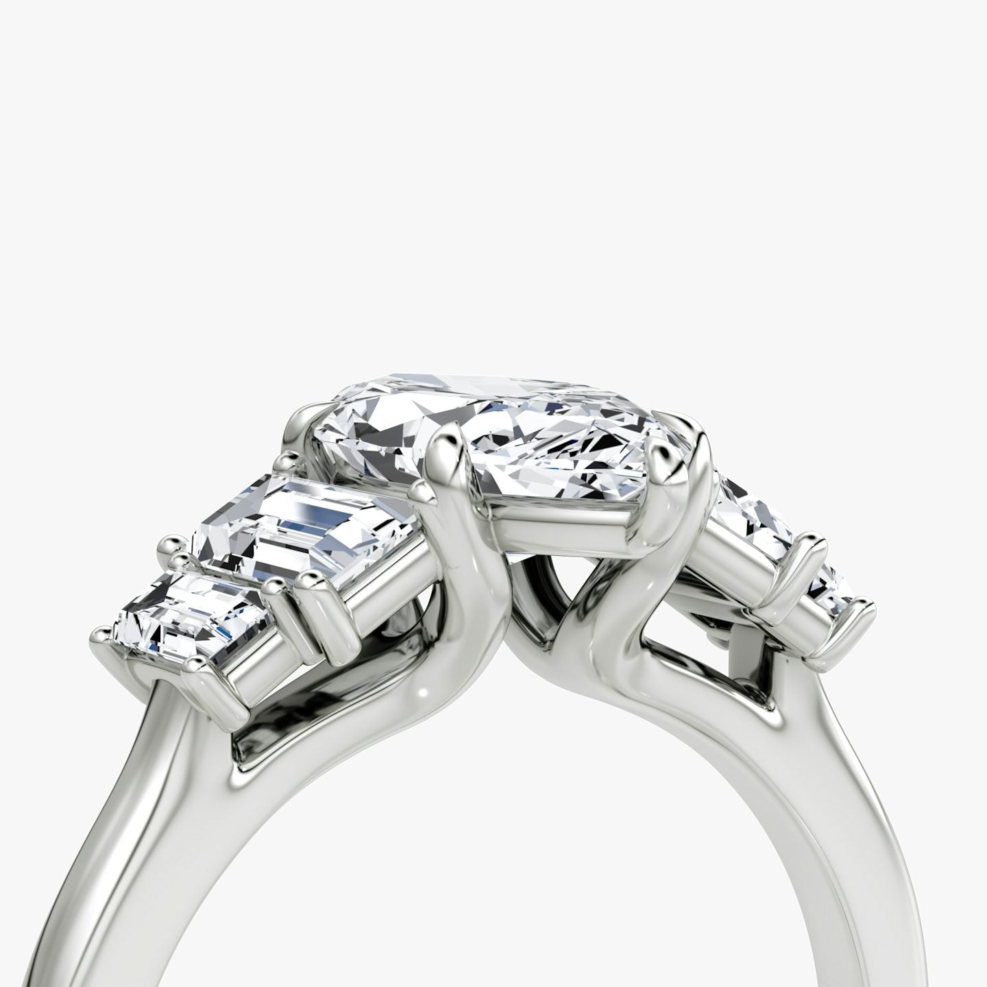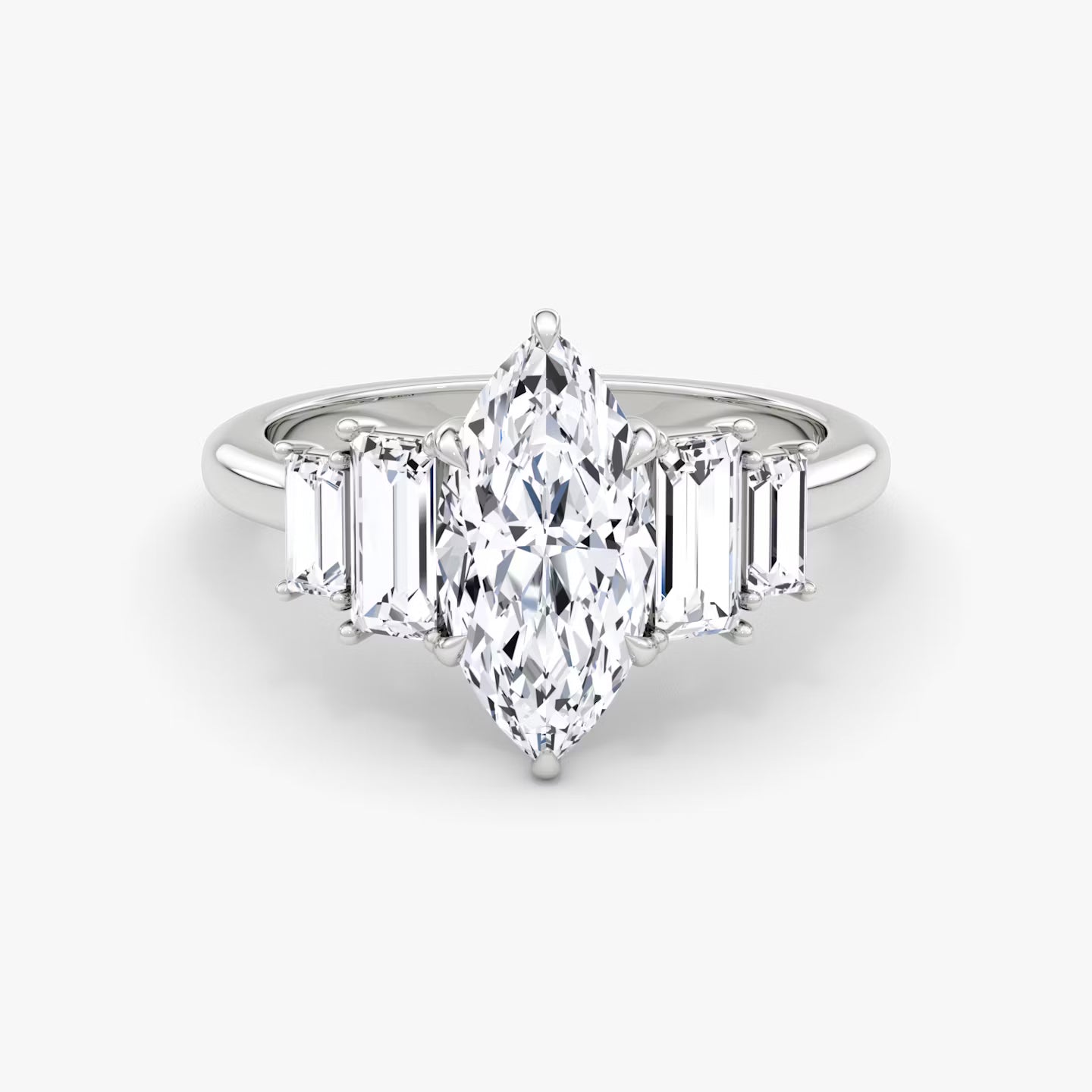 A Marquise-cut diamond engagement ring design featuring a prominent center stone secured in a four-prong setting, flanked by baguette-cut accent diamonds arranged in a symmetrical layout, creating a bold, geometric profile with refined sparkle and timeless elegance.