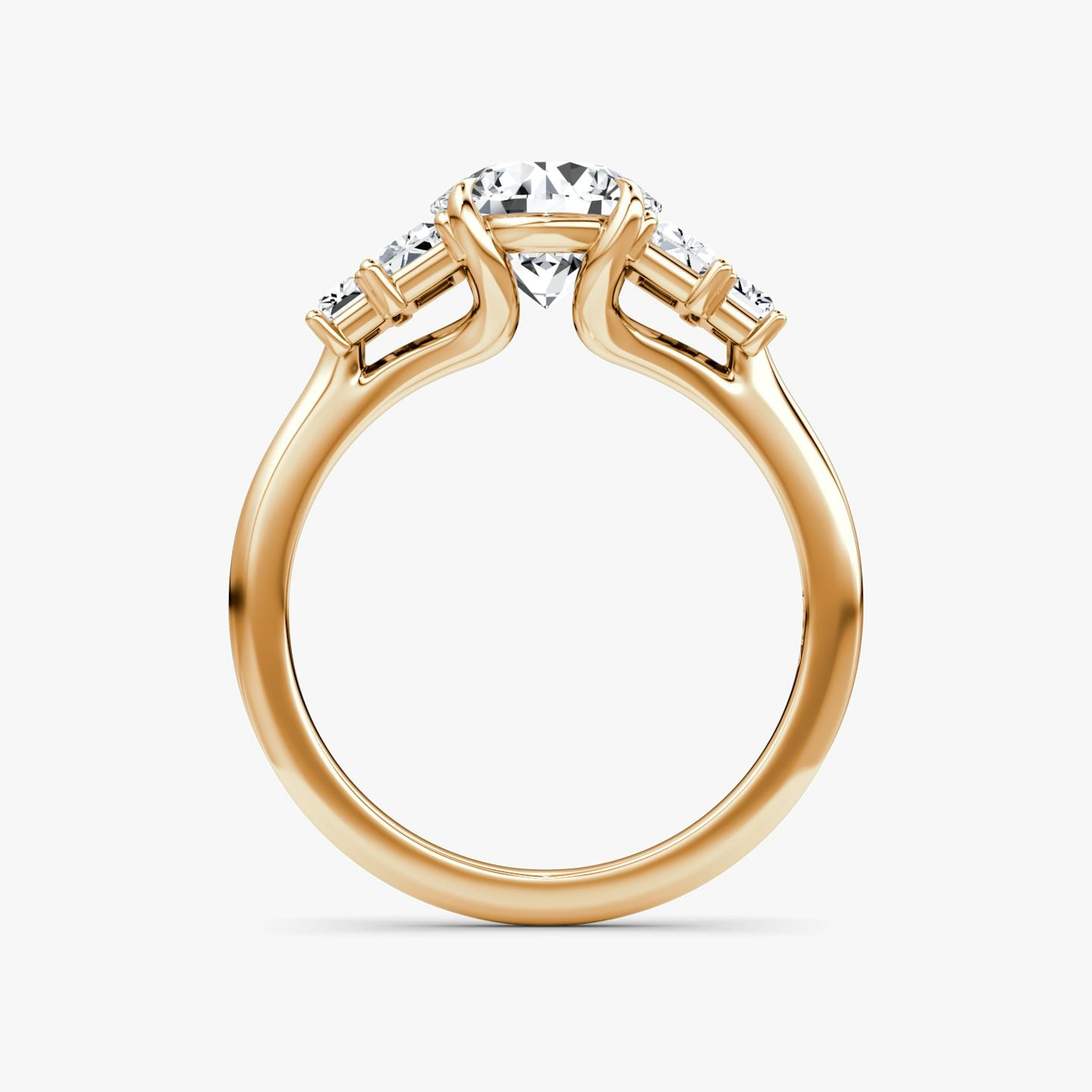 A Round Brilliant-cut diamond engagement ring design featuring a prominent center stone secured in a four-prong setting, flanked by baguette-cut accent diamonds arranged in a symmetrical layout, creating a bold, geometric profile with refined sparkle and timeless elegance.