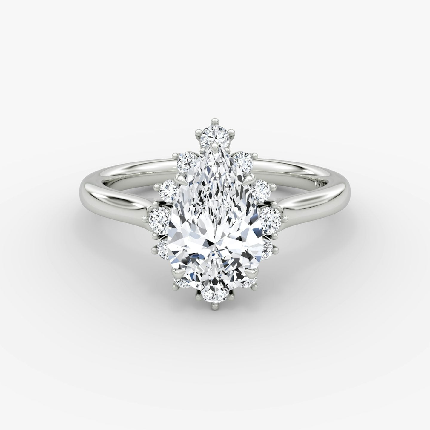 A floral-inspired halo engagement ring design featuring a prominent Pear-cut center stone secured in a prong setting, surrounded by a halo of smaller diamonds arranged in a starburst-like formation, with a smooth, tapered band creating a radiant and elegant silhouette.