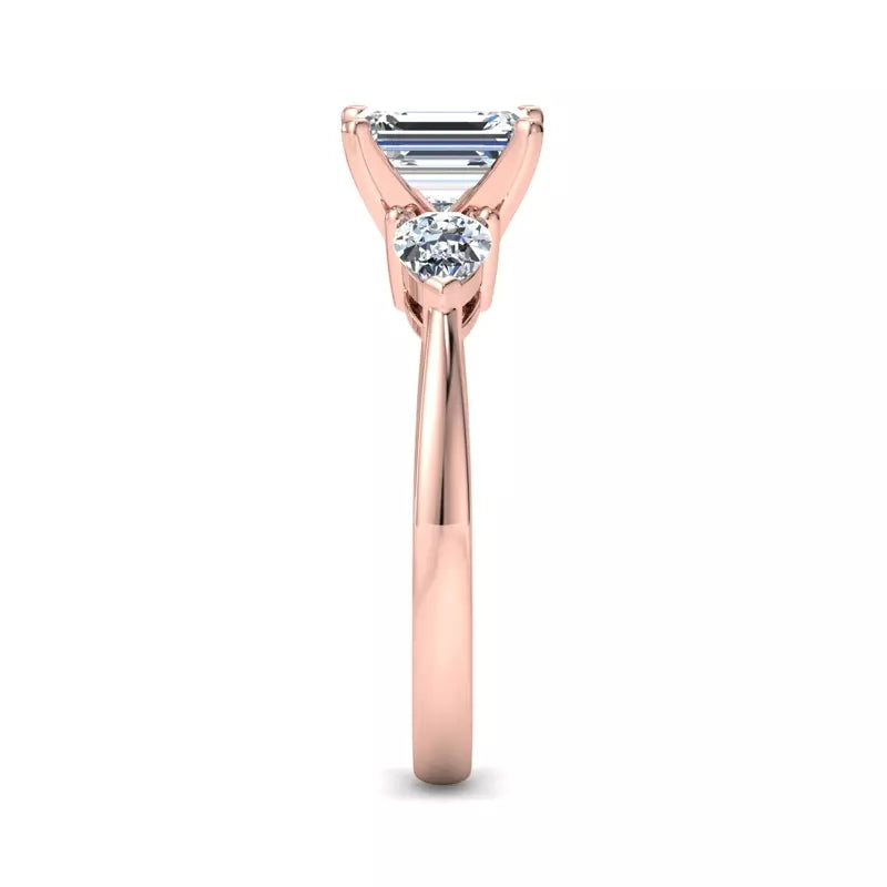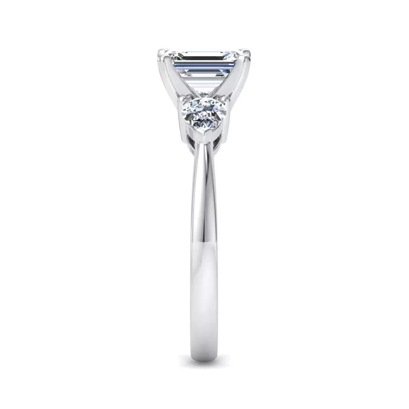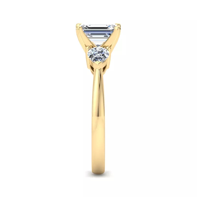 A three-stone engagement ring design featuring a prominent Emerald-cut center stone secured in a prong setting, flanked by two pear-shaped side stones for balanced brilliance and a refined, elegant profile.