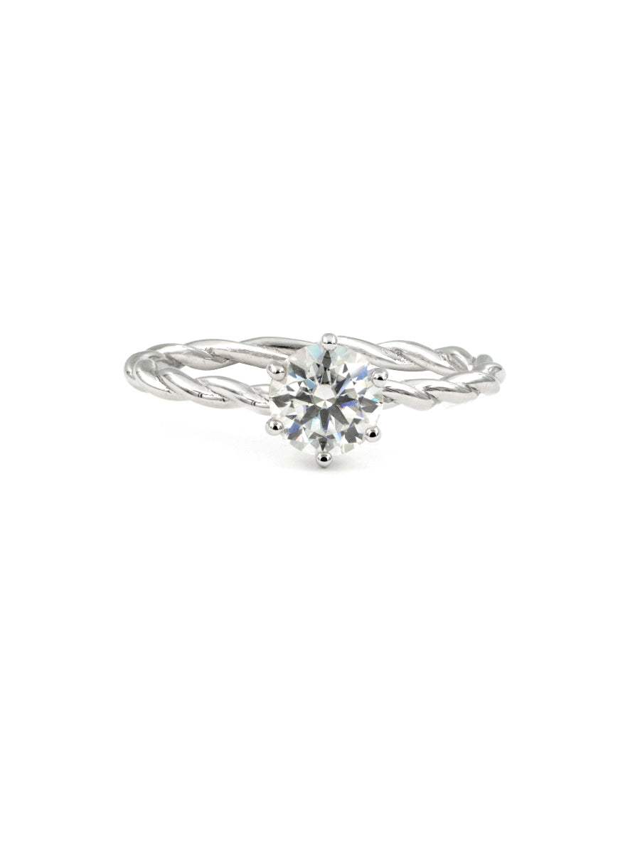 This timeless solitaire engagement ring has a twist band and a six-prong peg head. This style is a slightly bolder take on the ageless 4-prong classic ring.