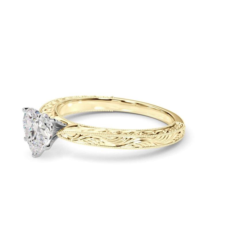 A vintage-inspired engagement ring design featuring a prominent Heart-cut center stone secured in a four-prong setting, with a finely engraved band showcasing swirling, leaf-like motifs, creating a romantic profile that blends classic elegance with artisanal detail.