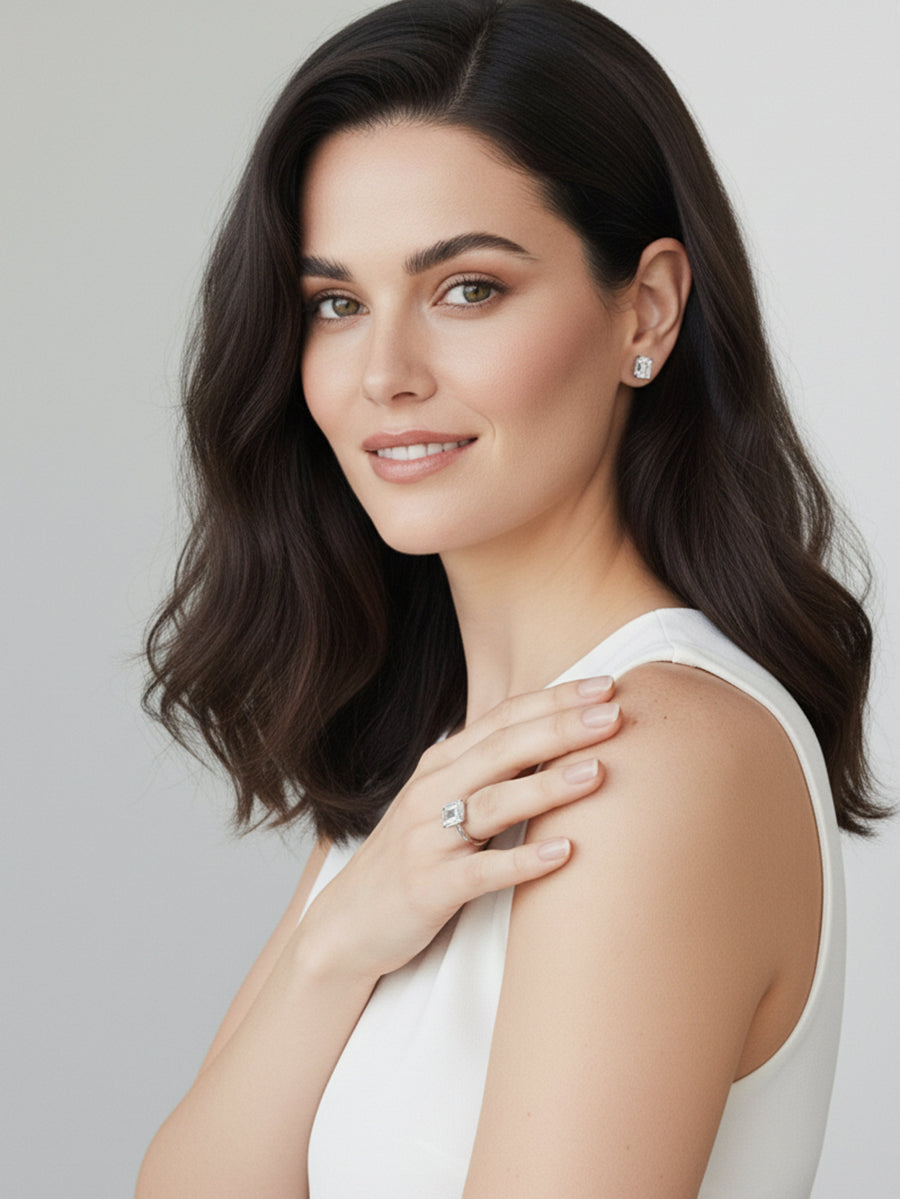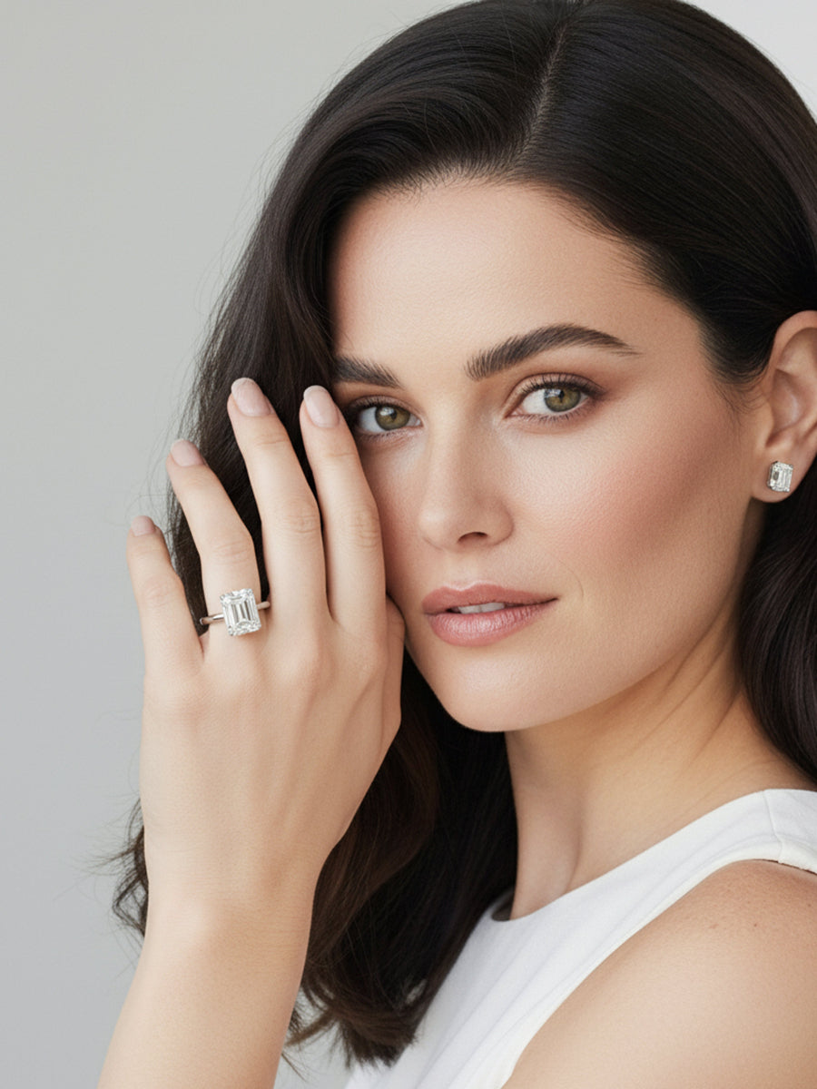 This elegant 925 silver engagement ring showcases a 3.0ct total weight Moissanite emerald cut, exuding timeless sophistication and brilliance. The clean lines and modern design make it a perfect choice for those seeking a refined yet striking symbol of love.