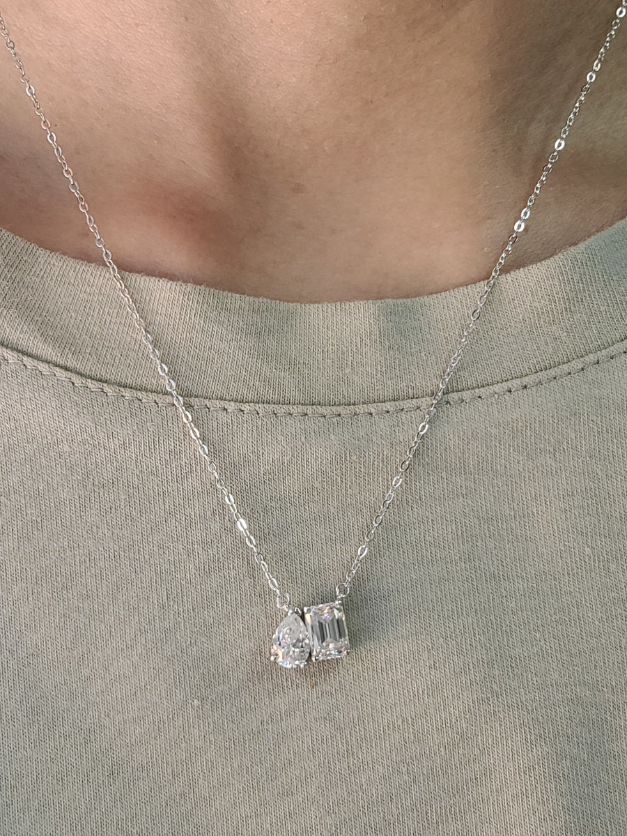 This toi et moi pendant, which has an emerald-cut and pear-cut stone, is a sophisticated example of simplicity. It is the ideal piece to dress up or down; set in 925 sterling silver, it is as beautiful as it is functional, with a 16 or 18-inch adjustable cable chain.