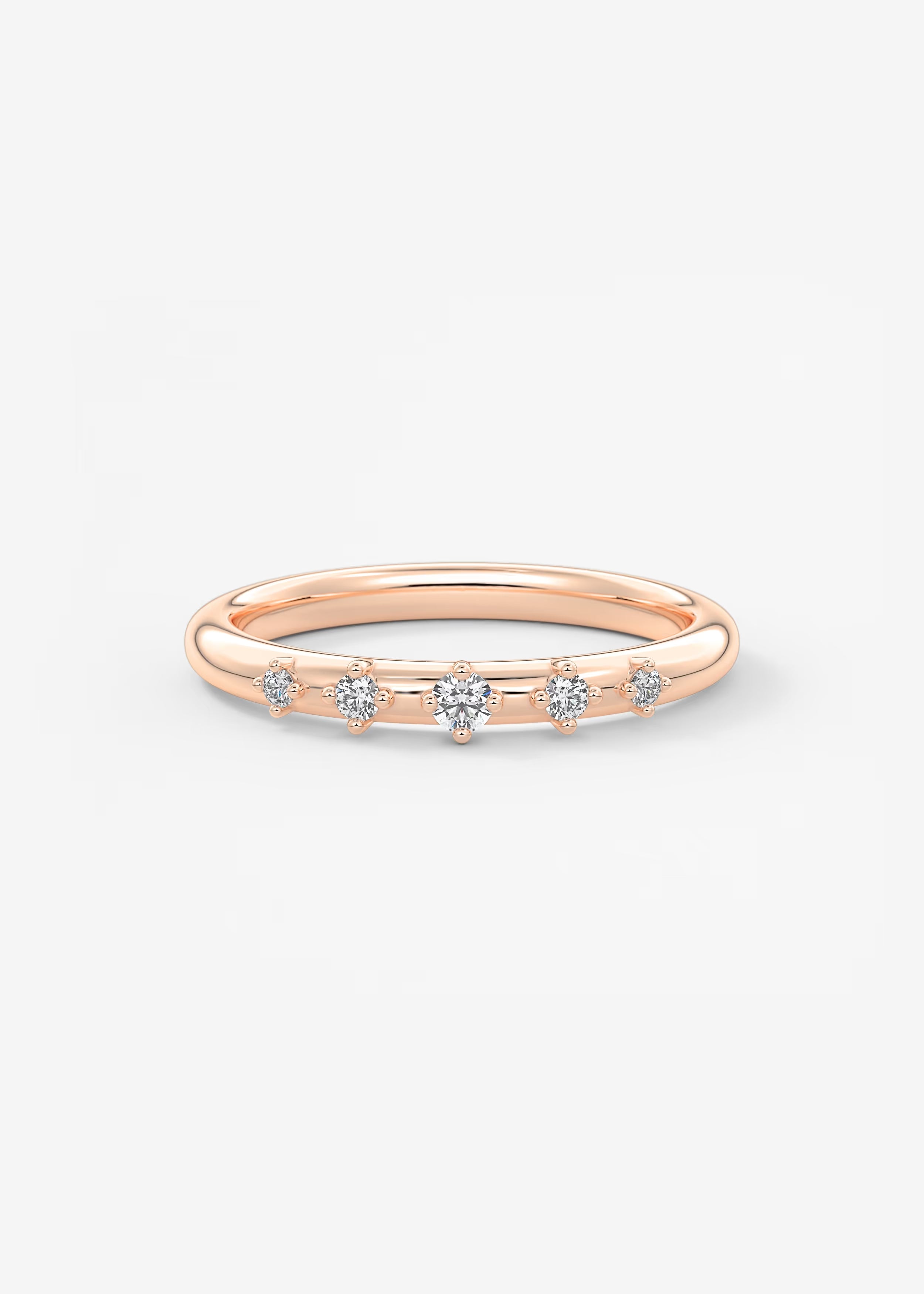 A polished gold band accented with evenly spaced round lab‑grown diamonds for a clean, minimalist sparkle. Its refined symmetry and slim profile make it a versatile piece for everyday wear, stacking, or pairing with engagement rings.