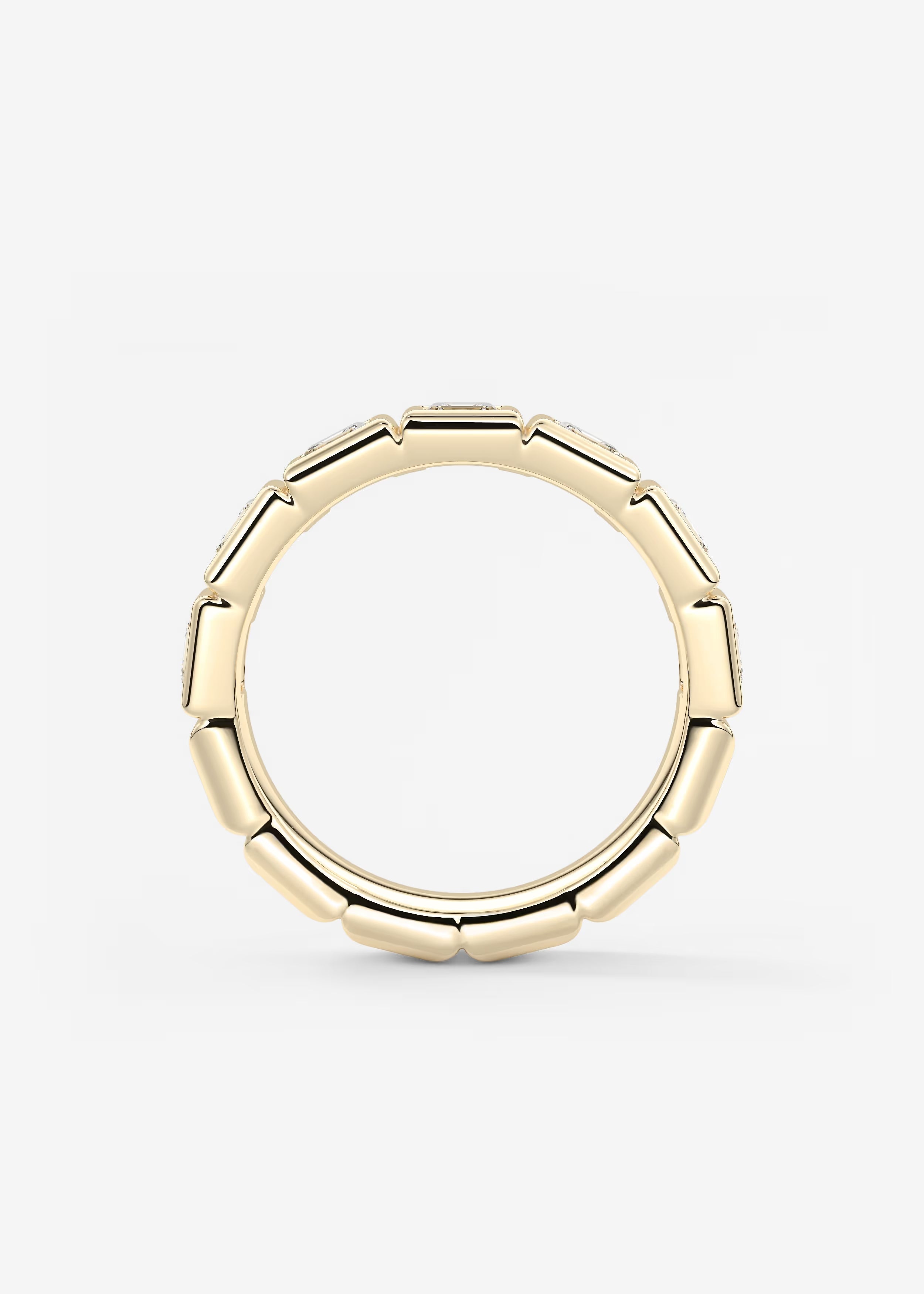 A polished gold band featuring square bezel‑set lab‑grown diamonds arranged in a clean geometric pattern. The structured silhouettes and even spacing create a refined, contemporary look that stands out on its own or pairs effortlessly with other minimalist pieces.