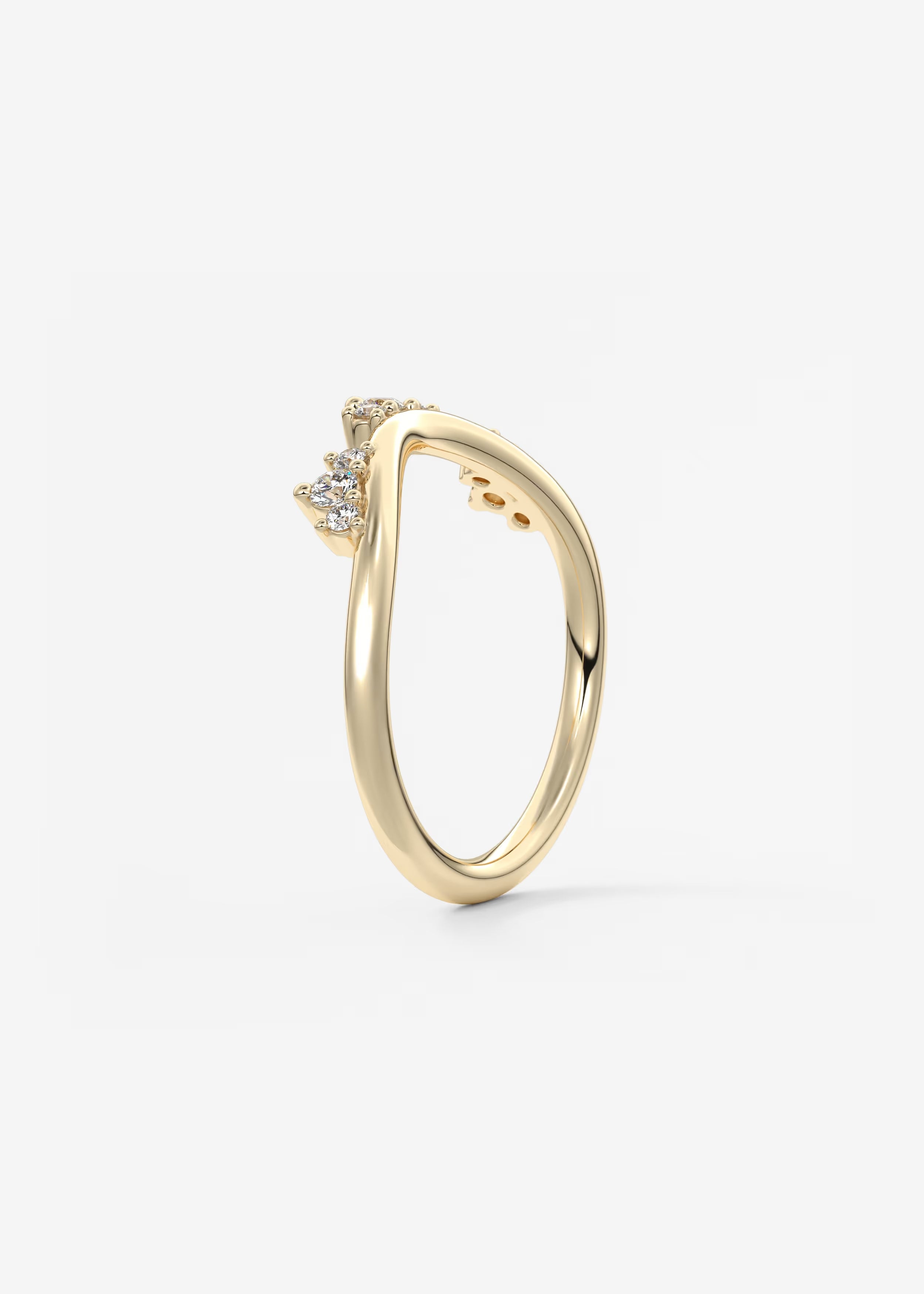 A polished gold curved band accented with a soft cluster of round lab‑grown diamonds, arranged in an elevated center for a subtle crown‑like sparkle. The graceful arc and refined proportions make it an elegant choice for stacking or pairing with engagement rings.