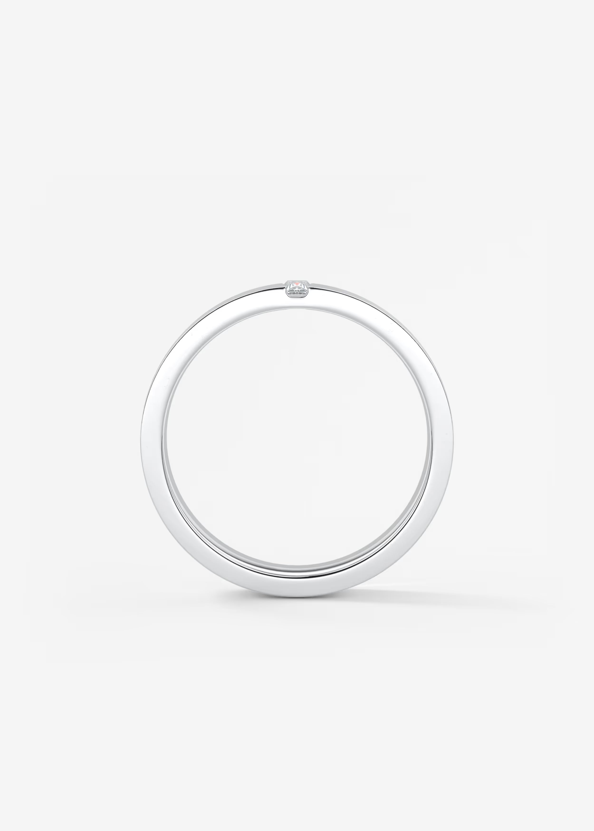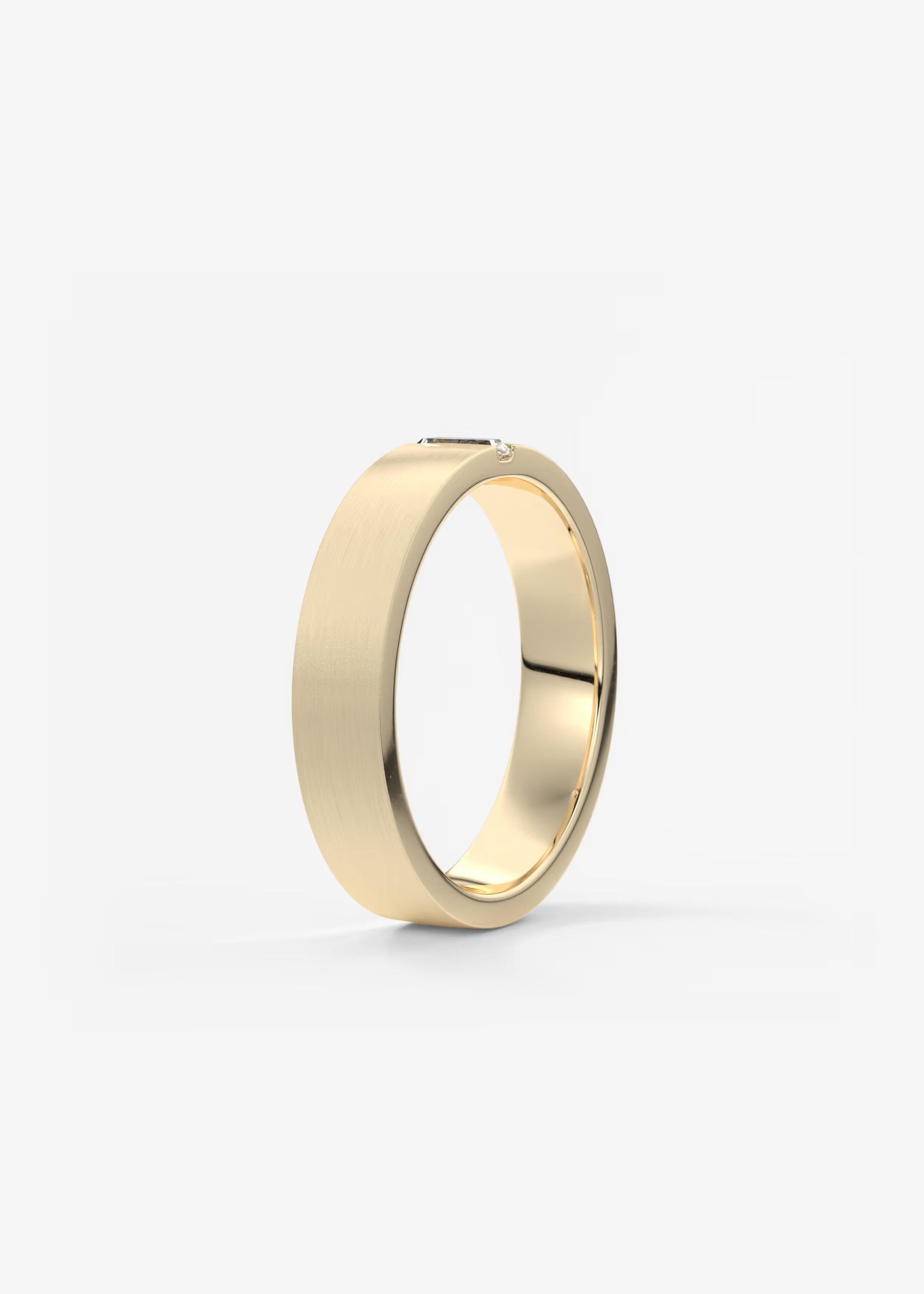 A wide matte‑finished gold band highlighted by a vertically set baguette‑cut lab‑grown diamond at the center, contrasted with a polished inner surface for a refined dual‑finish look. The clean lines and modern silhouette make it a distinctive choice for contemporary styling or a unique wedding band.