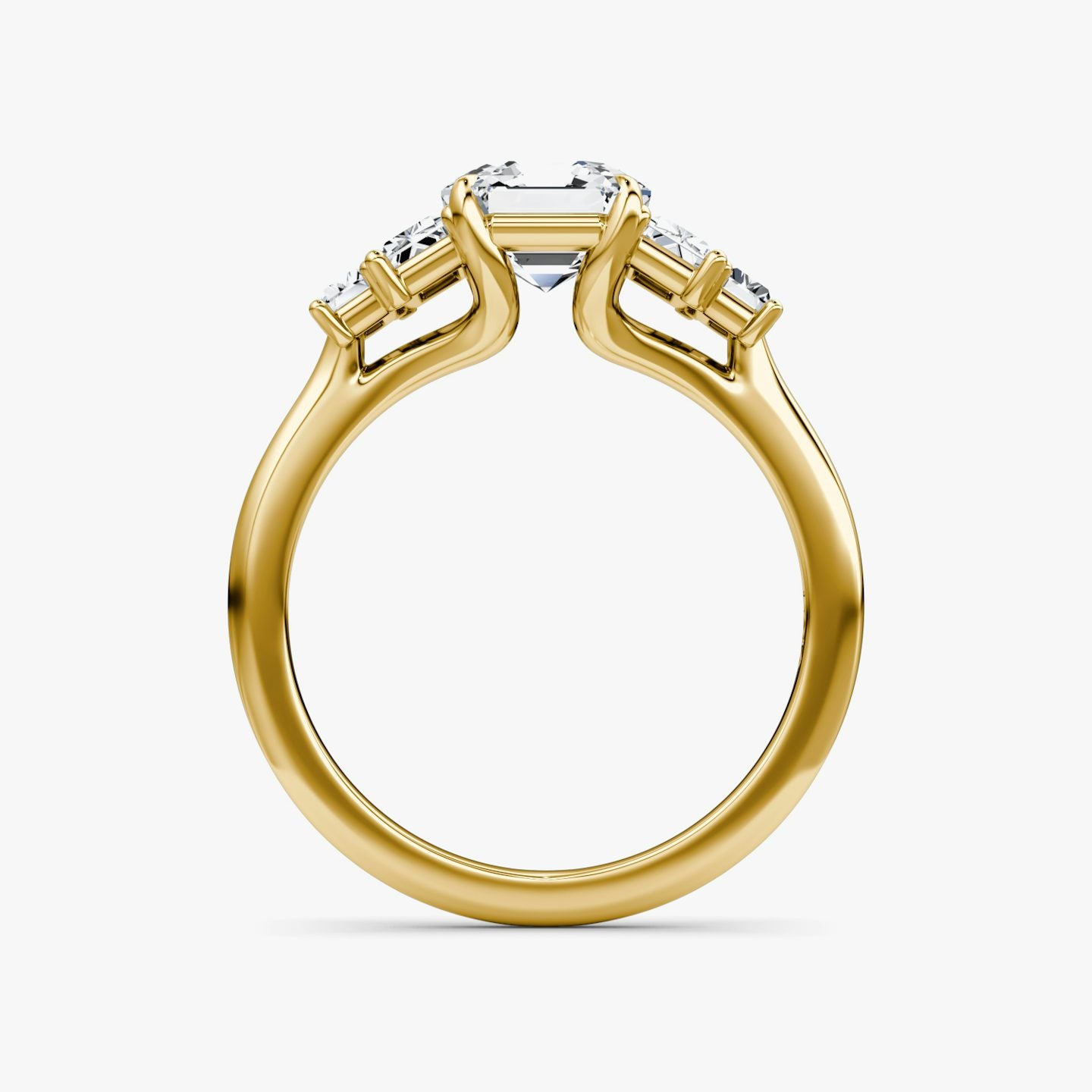 A Asscher-cut diamond engagement ring design featuring a prominent center stone secured in a four-prong setting, flanked by baguette-cut accent diamonds arranged in a symmetrical layout, creating a bold, geometric profile with refined sparkle and timeless elegance.