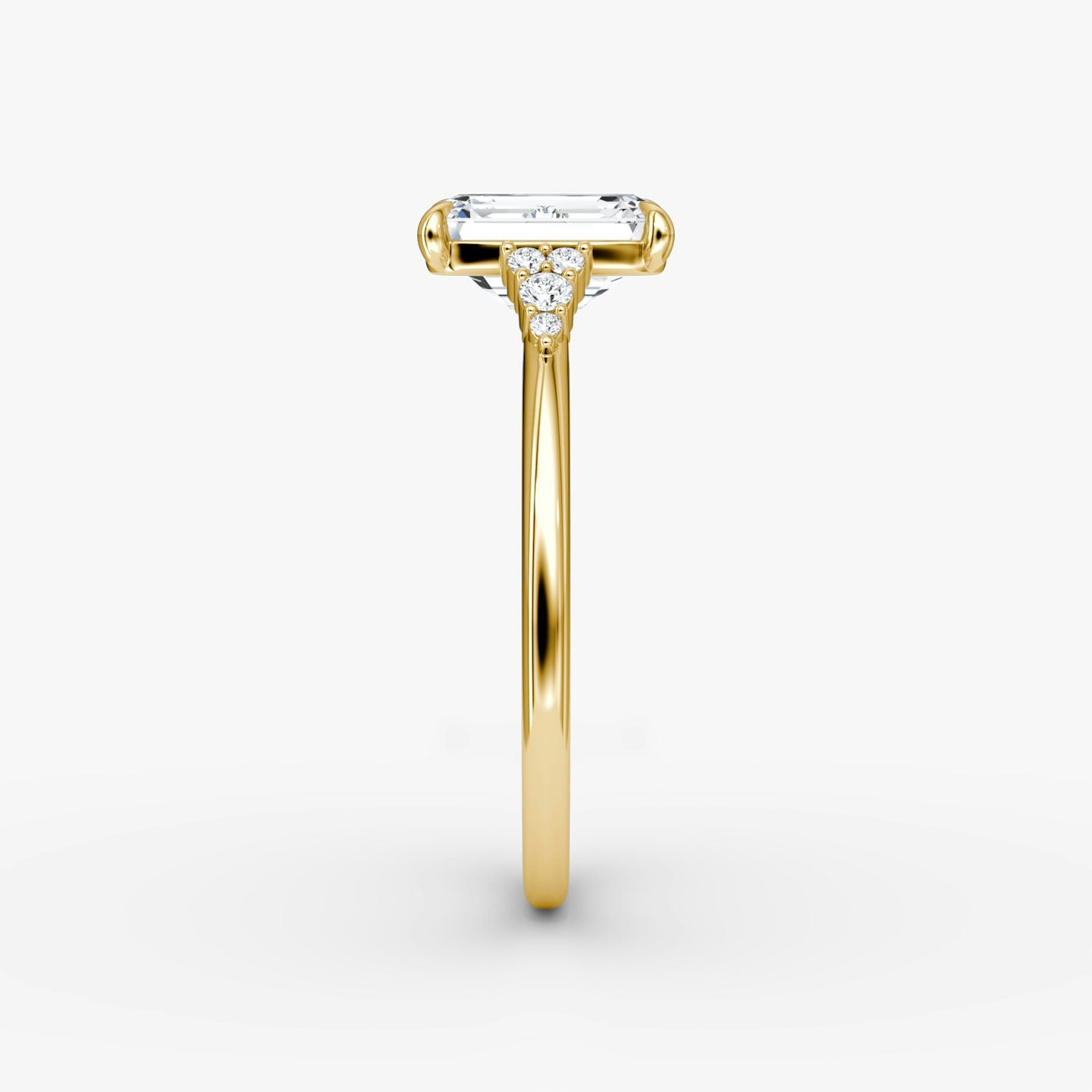 A multi-stone engagement ring design featuring a prominent Emerald-cut center stone secured in a four-prong setting, flanked by accent diamonds set into the polished band for added brilliance, creating a clean, elegant profile with geometric sparkle and timeless charm.