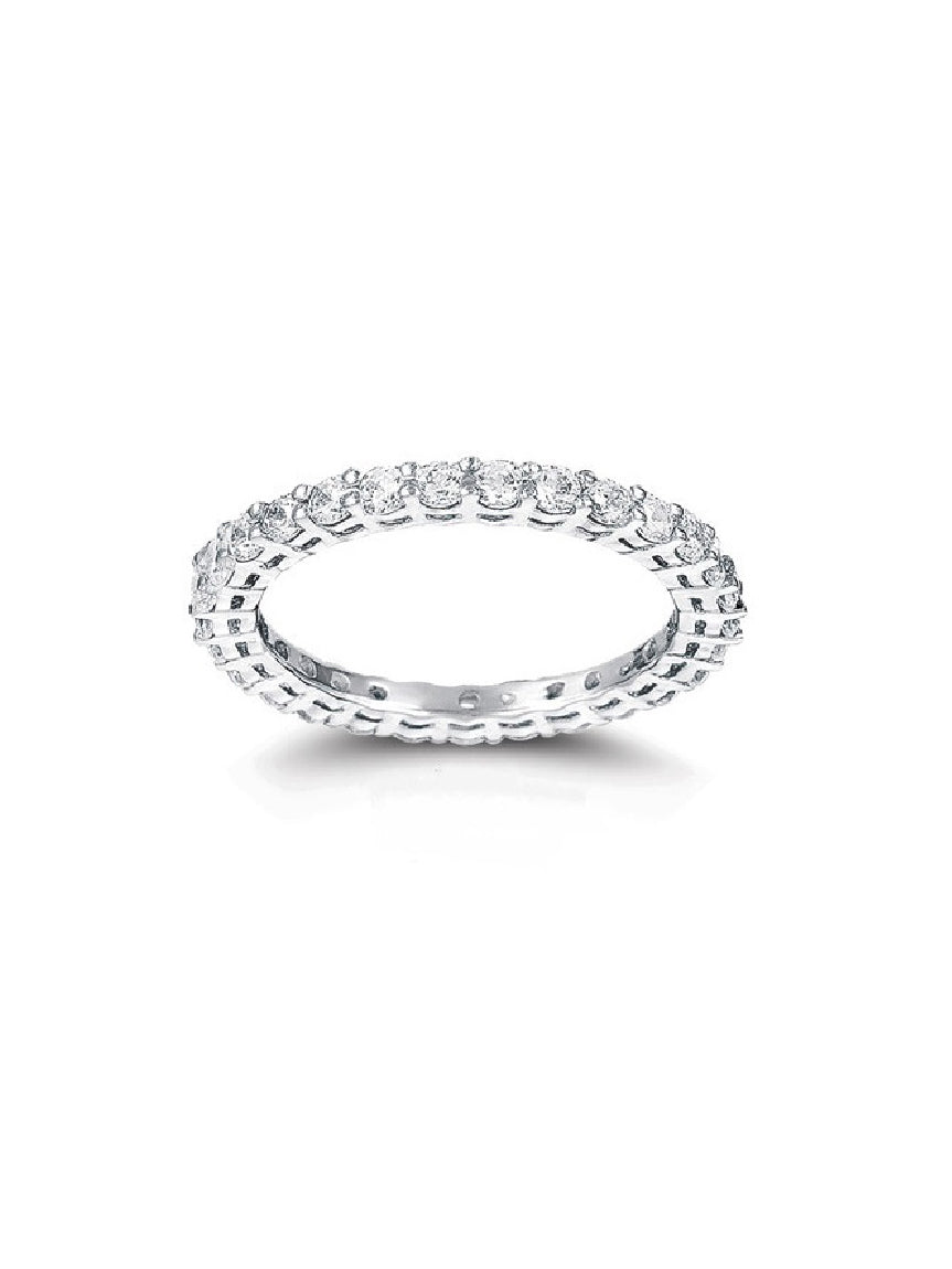 Brilliant lab-grown moissanite beautifully encircle the majority of the band in this timeless eternity wedding ring's classic shared prong setting.