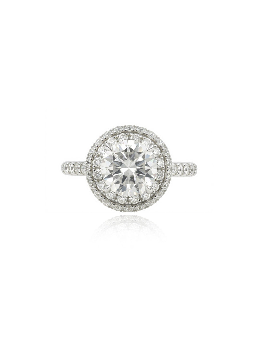 The round-cut center diamond or gemstone of your choice is highlighted by the pavé-set diamonds on the halo and around each side of the shank of this stunning engagement ring. For gemstones and fancy-shaped diamonds, please allow extra time.