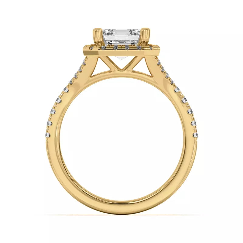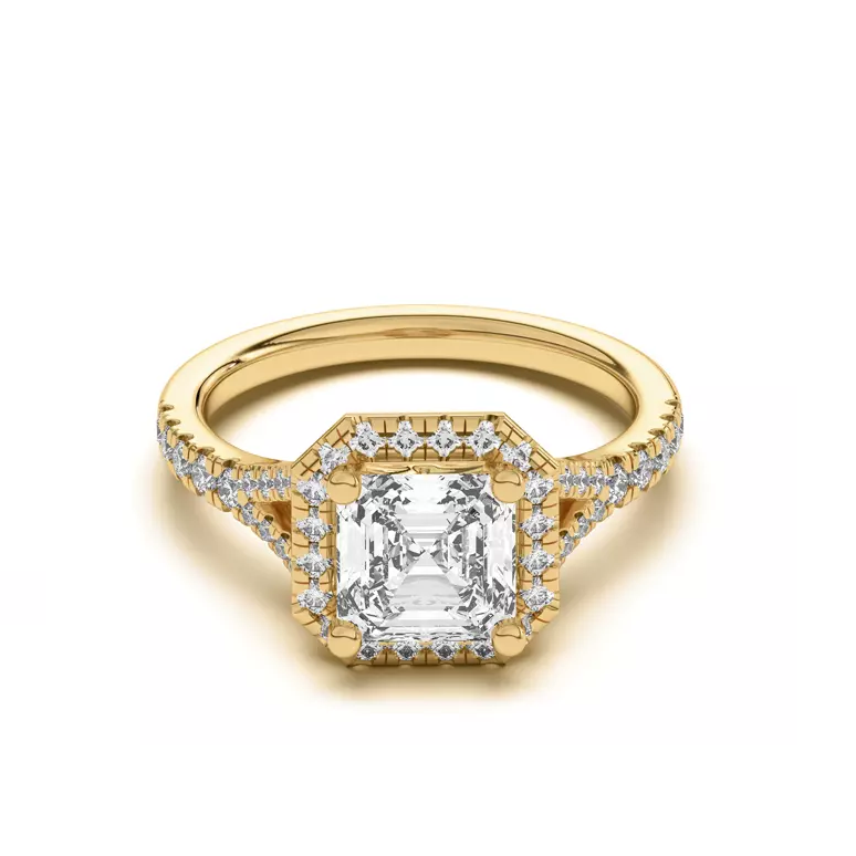 A classic halo engagement ring design featuring a prominent Asscher center stone surrounded by a ring of smaller diamonds, with additional diamonds set along the upper shank for continuous sparkle and a refined, elegant profile.