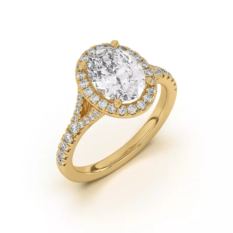 A classic halo engagement ring design featuring a prominent Oval center stone surrounded by a ring of smaller diamonds, with additional diamonds set along the upper shank for continuous sparkle and a refined, elegant profile.